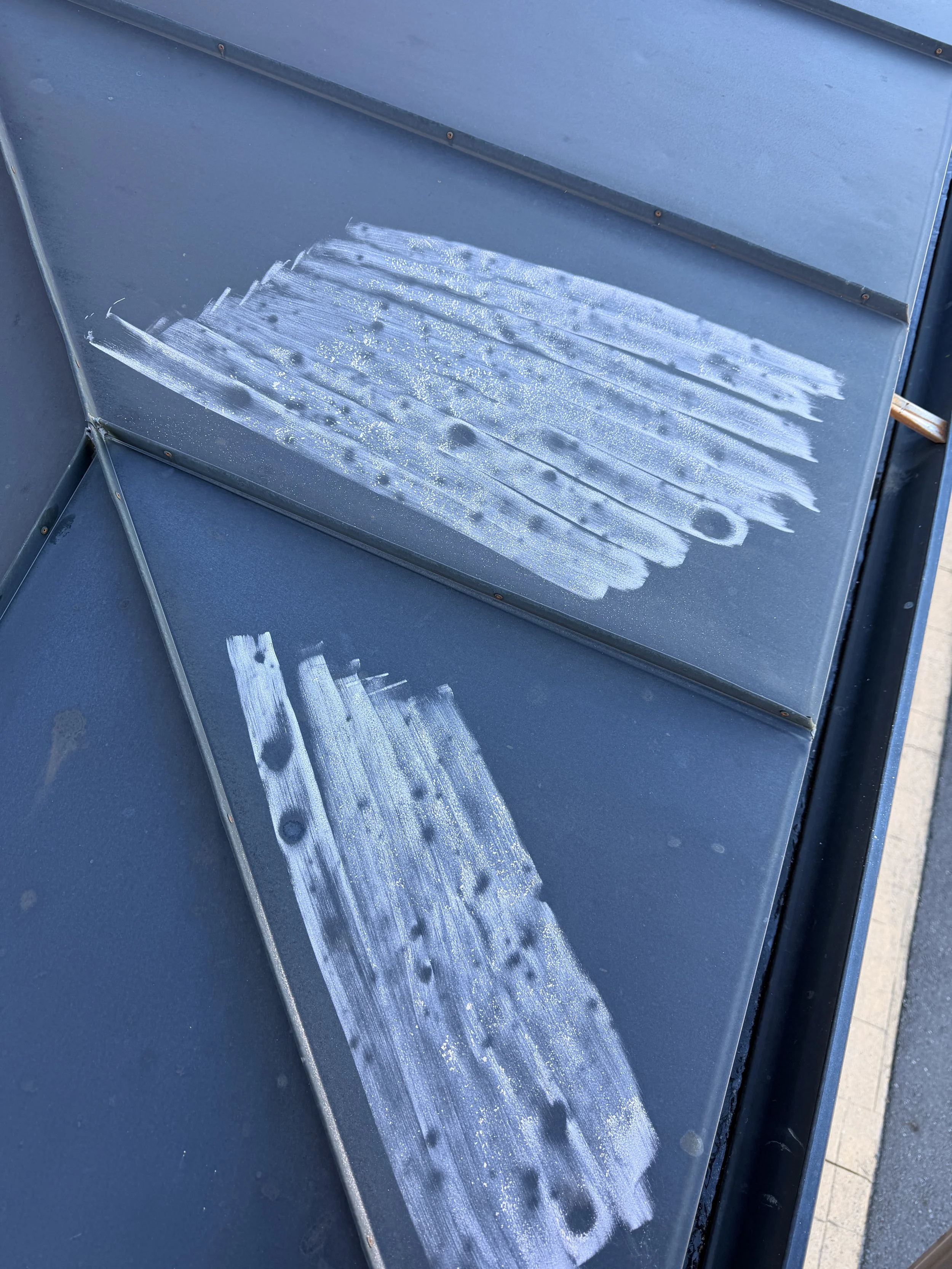 The white chalk you see brushed across this metal roof is a hail damage test. It highlights impact points left behind by hailstones. Dents and surface trauma that often blend in and go unnoticed from the ground.